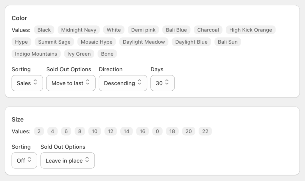 Unlike manual merchandising, Product Sorting updates continuously. When a variant sells out, it’s automatically deprioritized. When inventory is restocked, it’s automatically re-promoted. When a new color starts trending, it automatically rises in the rankings.