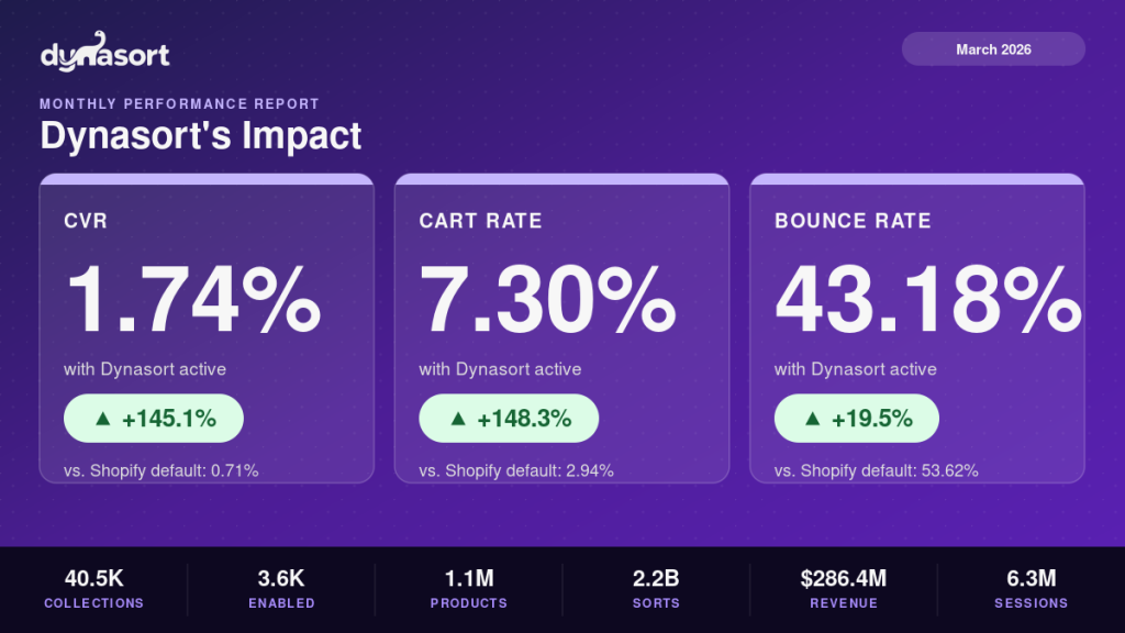 Most merchants don’t think much about collection sorting. They leave it on Shopify’s default settings — alphabetical, best-selling, newest first — and hope for the best. But “hope” isn’t a merchandising strategy. In March 2026, Dynasort tracked over 6.3 million collection sessions across thousands of Shopify stores, and the data tells a clear story: AI-optimized product sorting dramatically outperforms the default. Across every key metric — conversion rate, cart rate, exit rate, and bounce rate — Dynasort-sorted collections delivered meaningfully better results. Let’s break down exactly what that looks like.