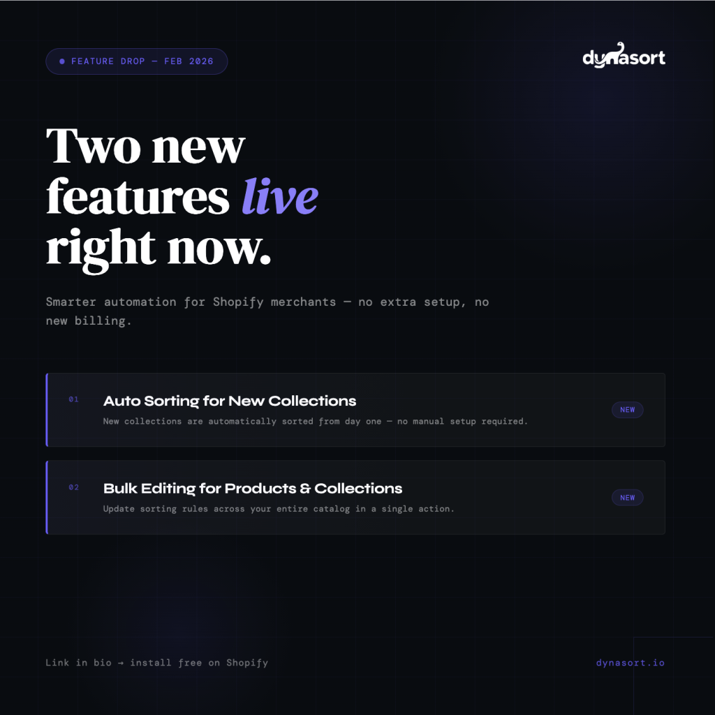 As always, we’re building based on what merchants actually need. If you have feedback on either feature — or ideas for what to tackle next — reach out at hello@dynasort.io or use the in-app chat.